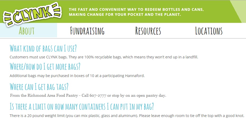 Donate your bottles and cans to the Richmond Area Food Pantry through Hannaford stores Clynk Community Cash Program!